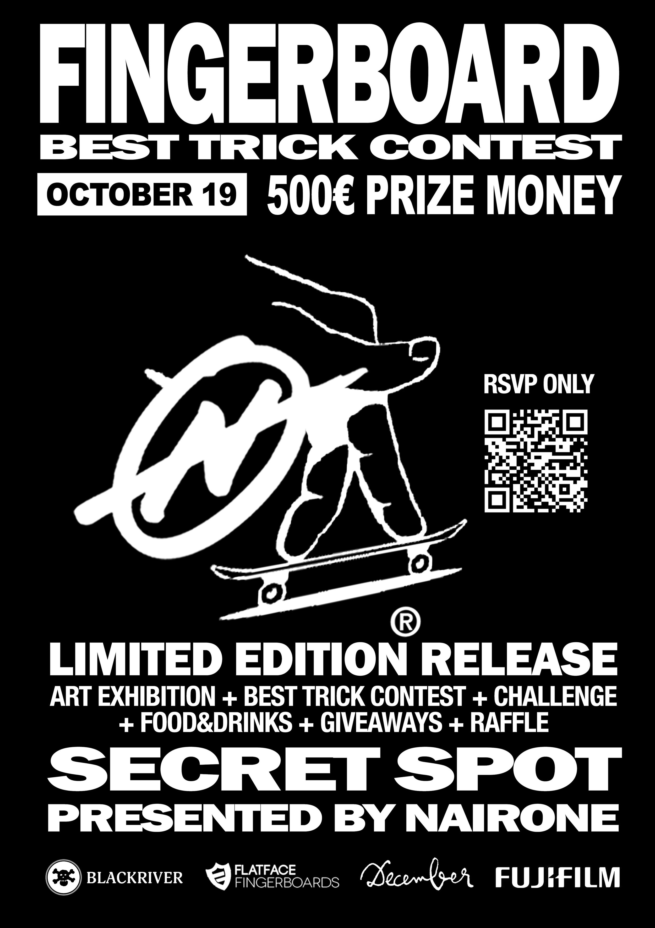 + FINGERBOARD BEST TRICKS CONTEST + SKATE GAME + CHALLENGE + RAFFLE + SOUNDS + FOOD&DRINKS + SURPRISES